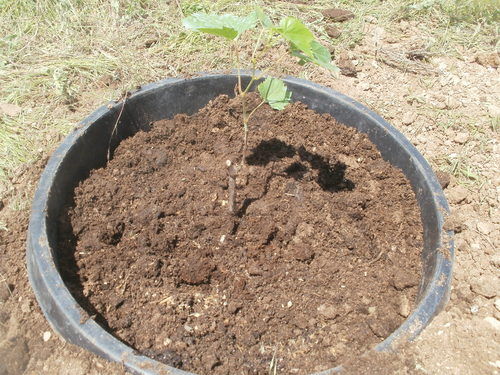 Then just fill with dirt, compost and a grape seedling. I covered it with straw mulch as a finishing touch.